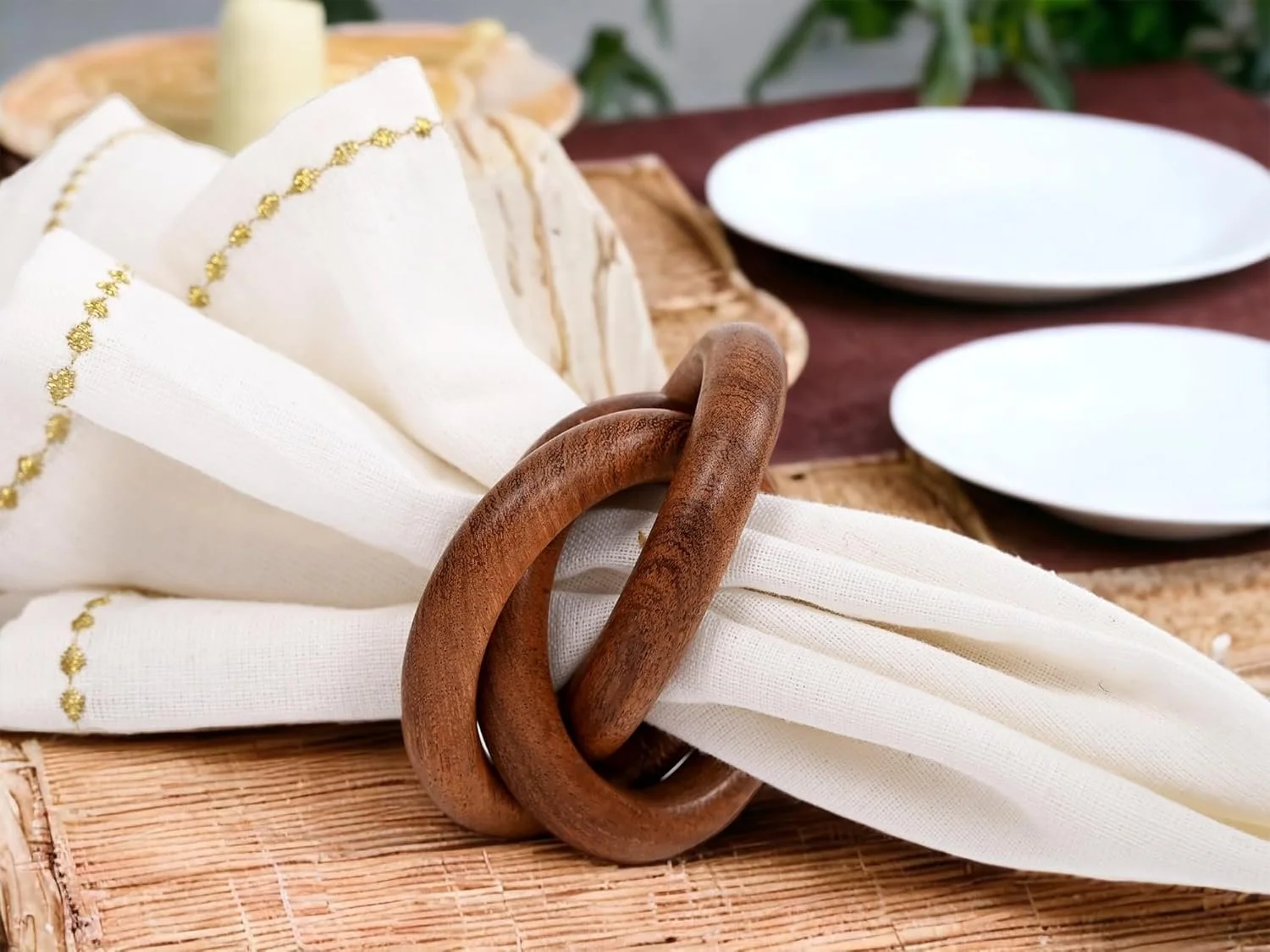 Add a natural touch to your tablescape with this set of hand-finished wooden napkin rings. The interlocking design makes a subtle statement while pairing beautifully with linen or cotton napkins. A versatile detail for casual meals or elevated gatherings alike.